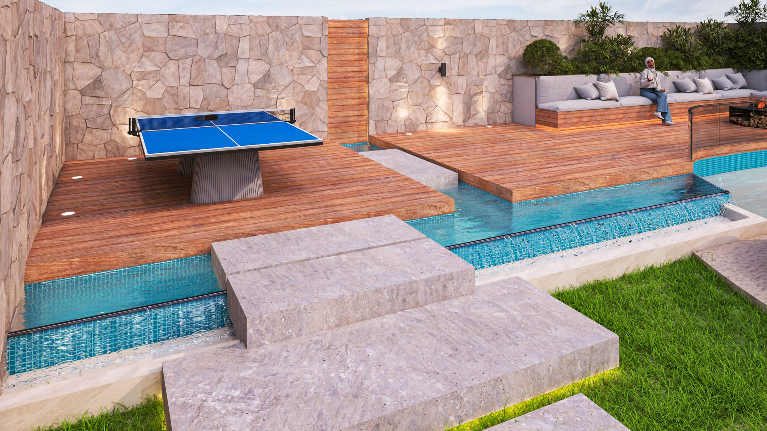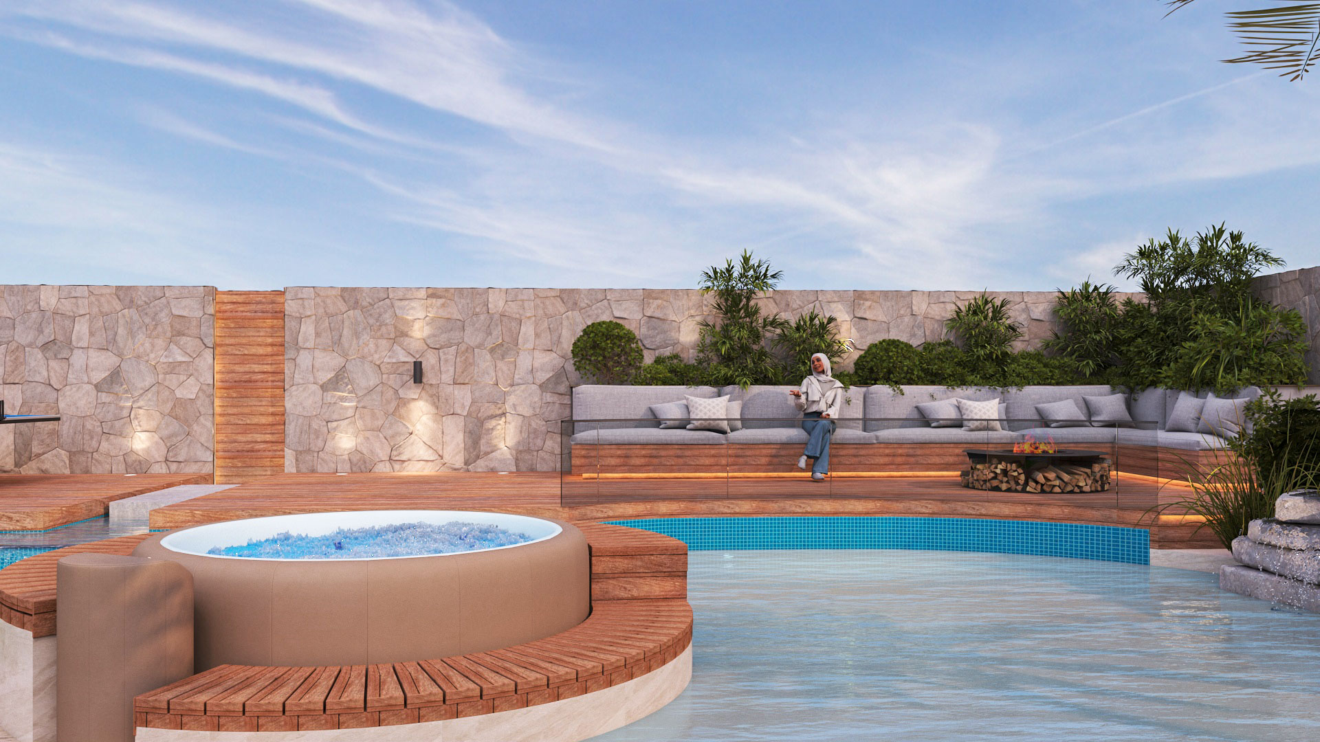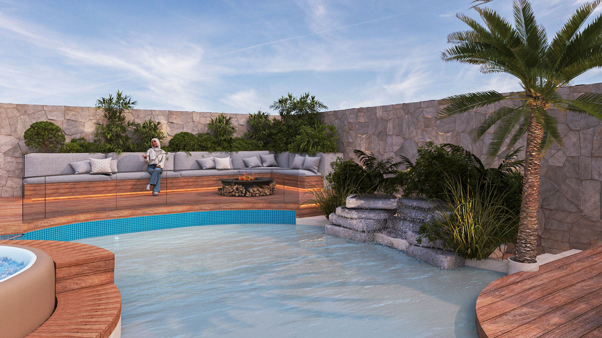 Materials were selected for their durability and aesthetic quality, blending modern finishes with natural elements to achieve a high-end outdoor atmosphere.