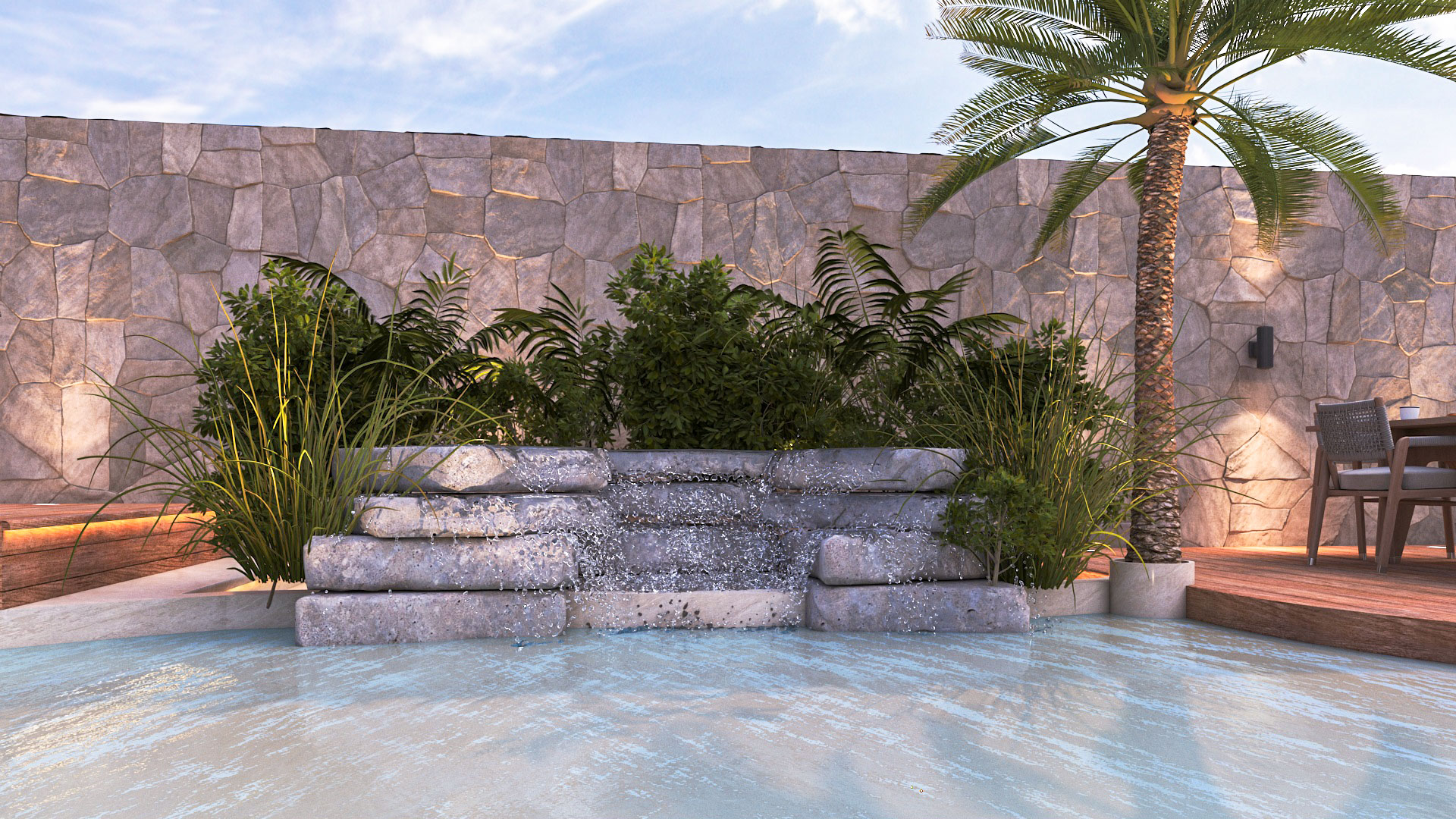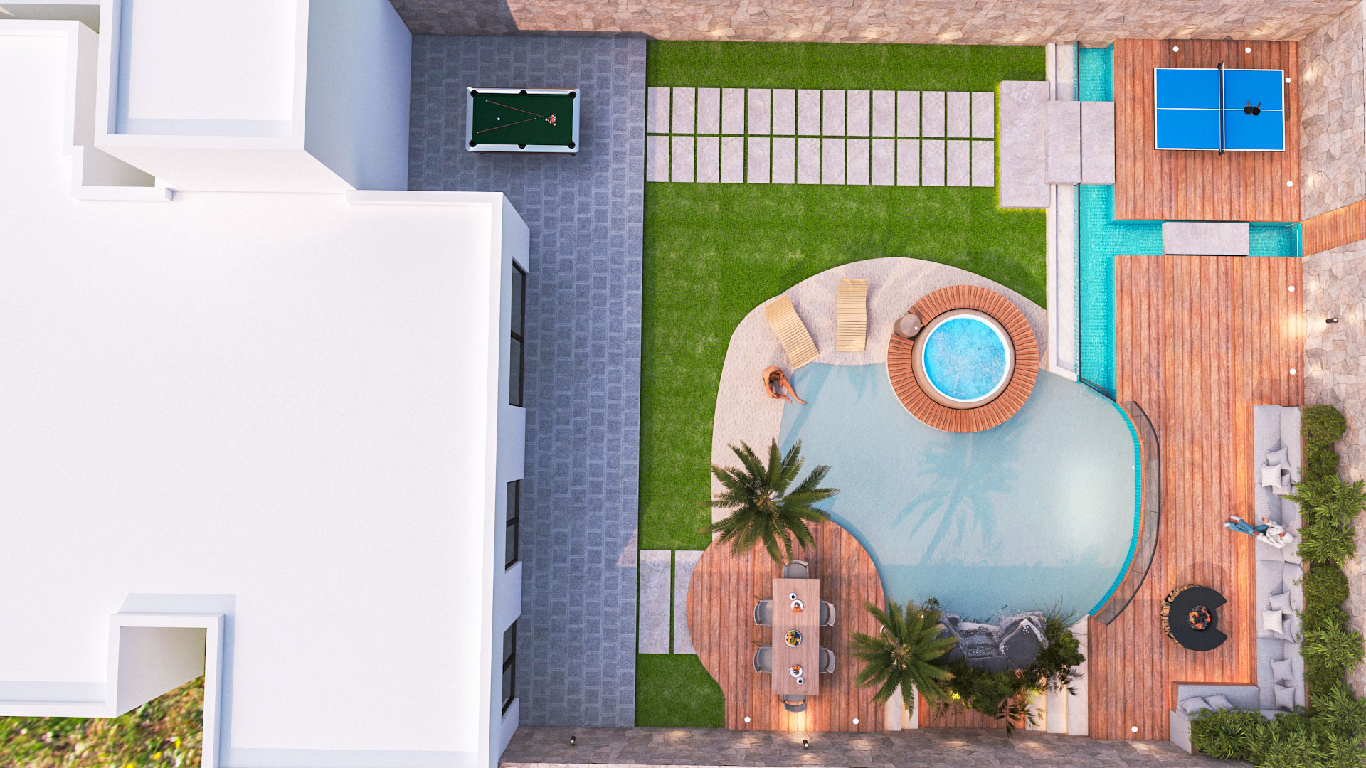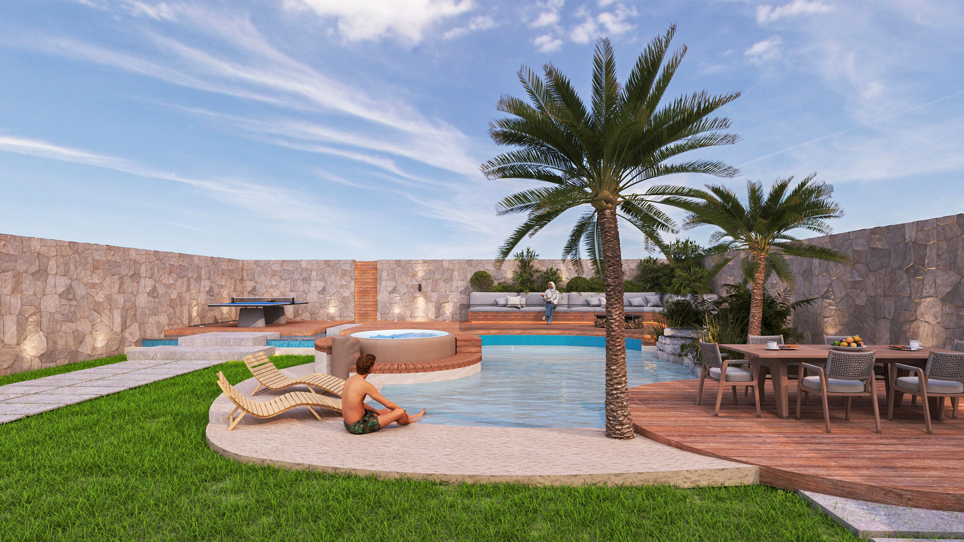 Materials were selected for their durability and aesthetic quality, blending modern finishes with natural elements to achieve a high-end outdoor atmosphere.