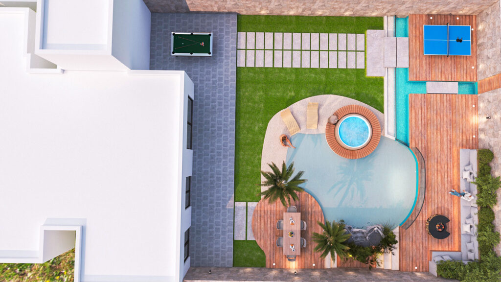 This project features a 3D exterior design for a private villa, focusing on the façade, landscaped garden, and swimming pool. The goal was to create an elegant and harmonious outdoor environment that enhances both comfort and architectural value.