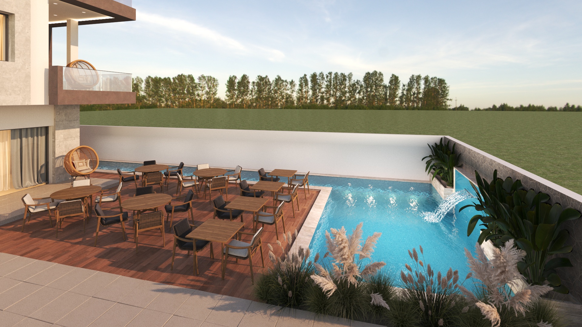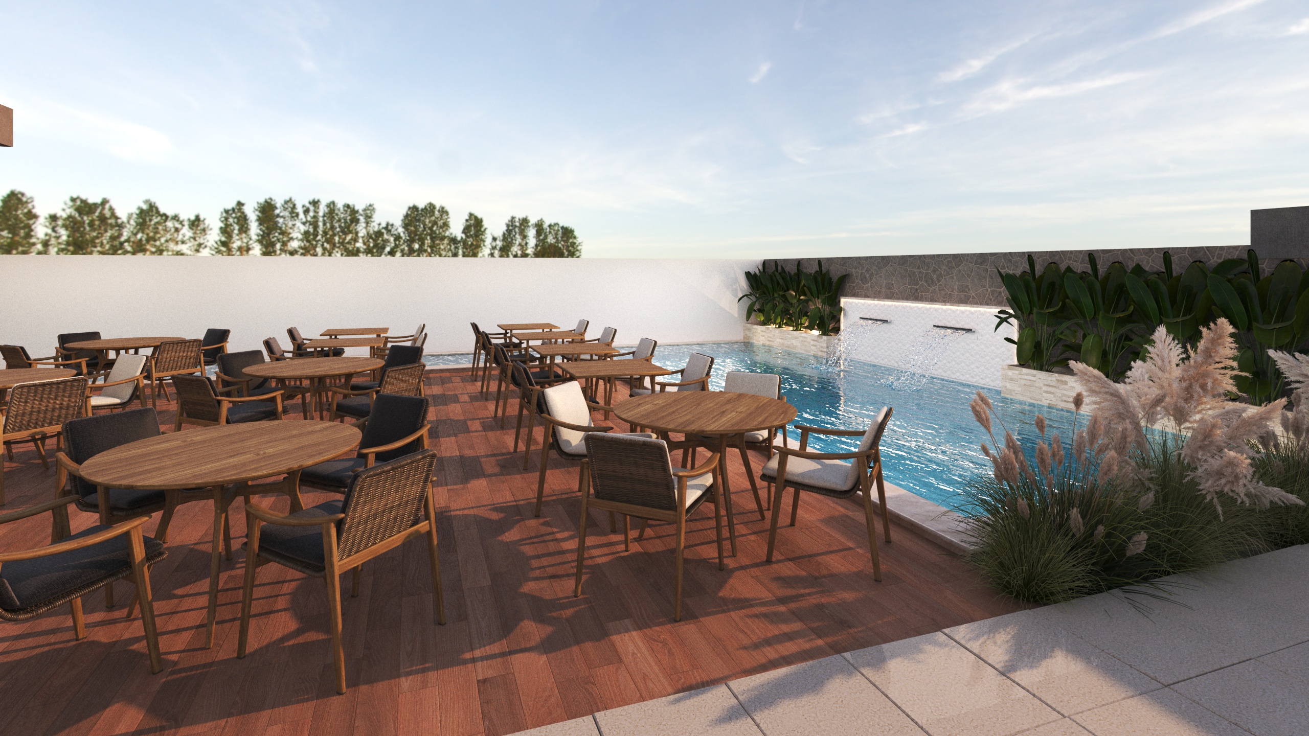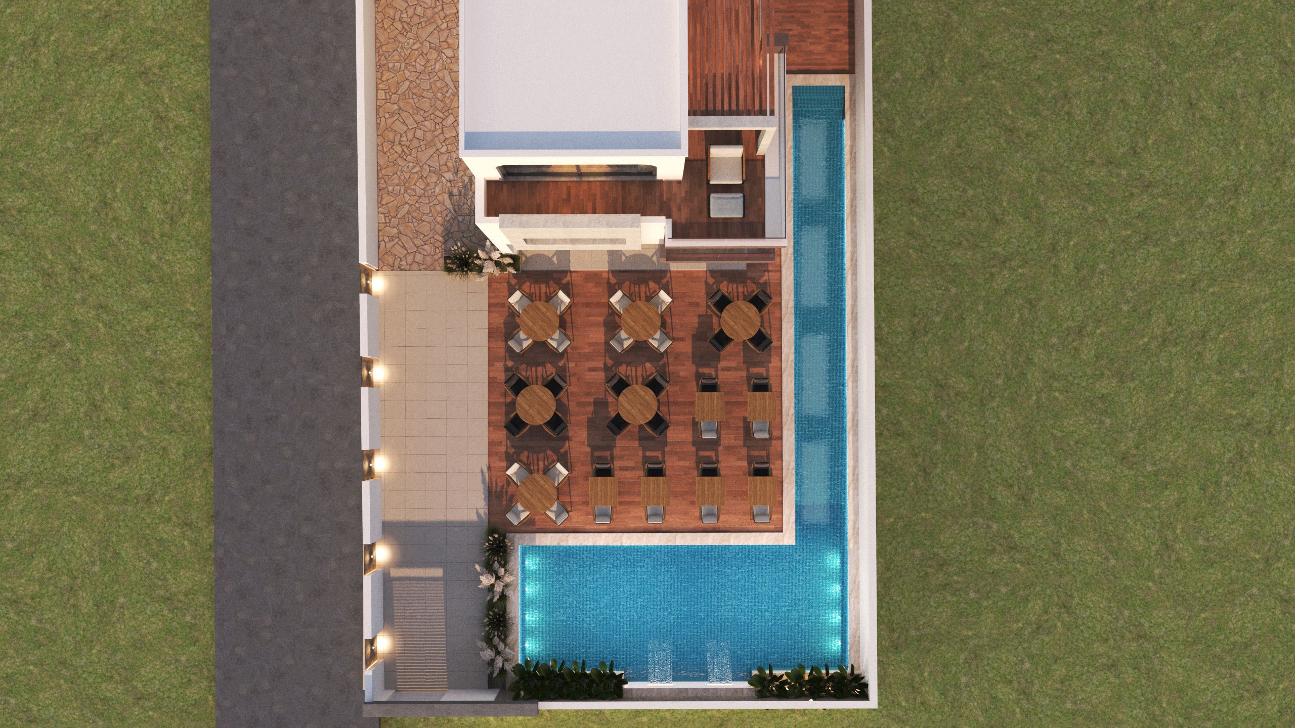The outdoor area features a swimming pool integrated with landscaped gardens, pathways, and seating zones. The layout is created to maximize relaxation, leisure, and visual appeal, enhancing the overall guest experience. -