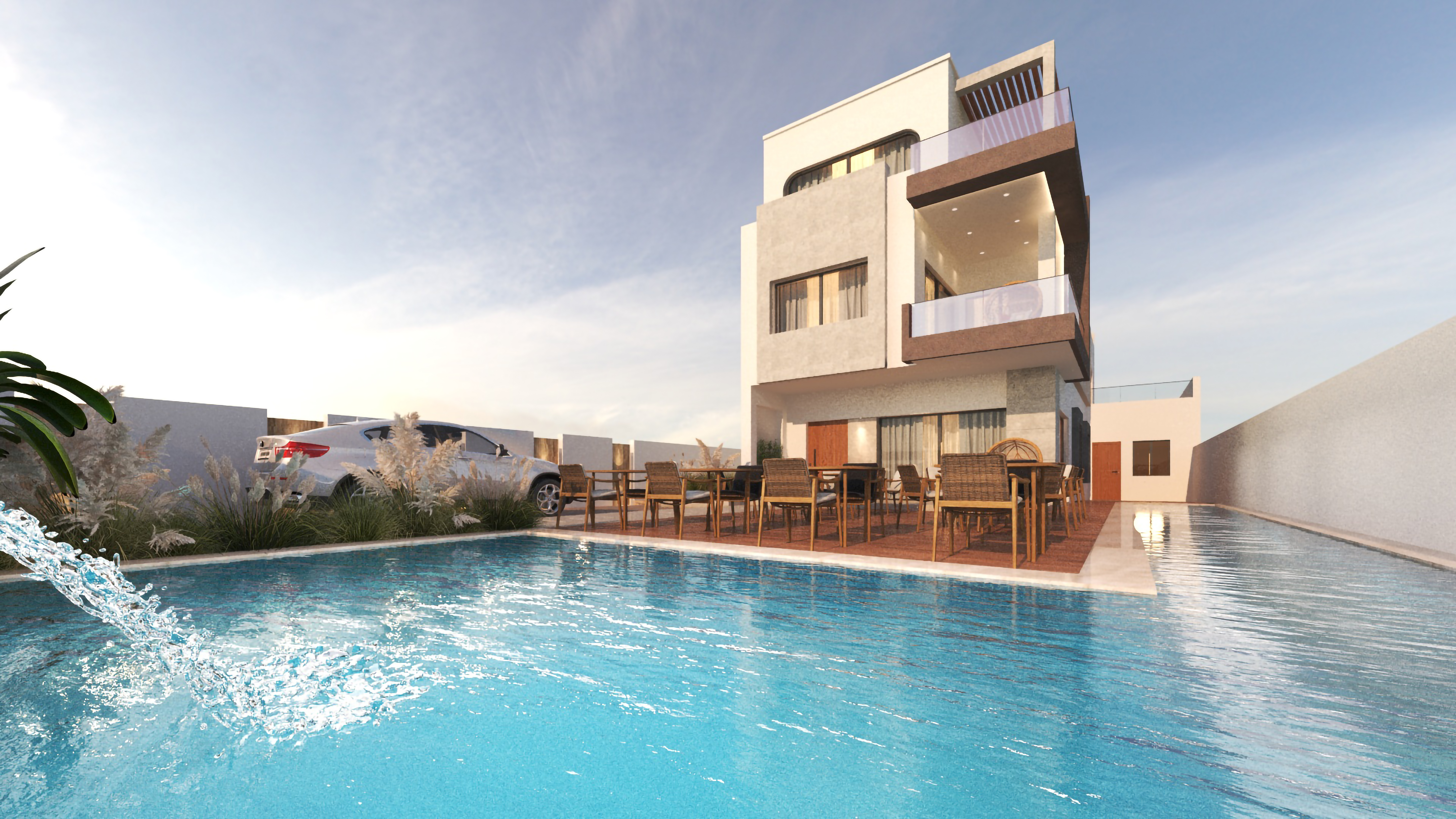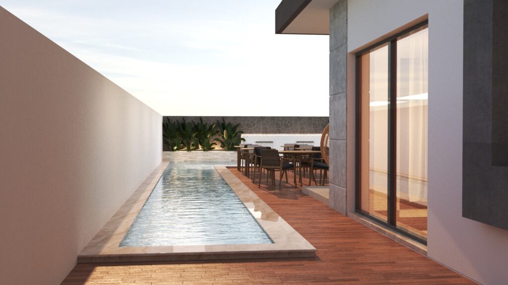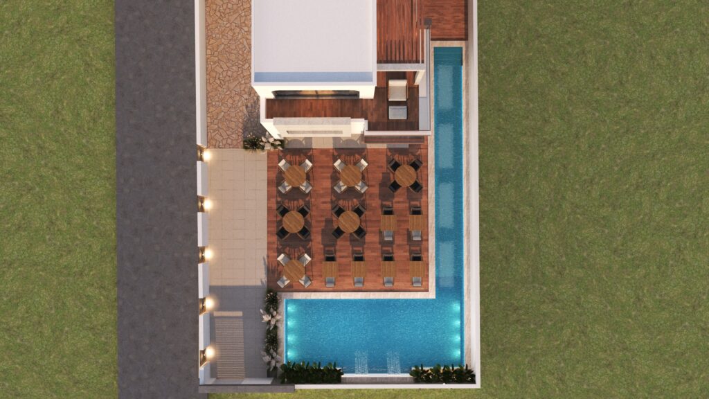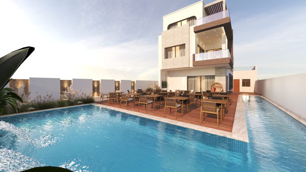 Comprehensive Visualization: The 3D modeling provides a realistic and detailed preview of the guesthouse, including the facade, interior, open spaces, pool, and garden, allowing clients to make informed design decisions before construction.