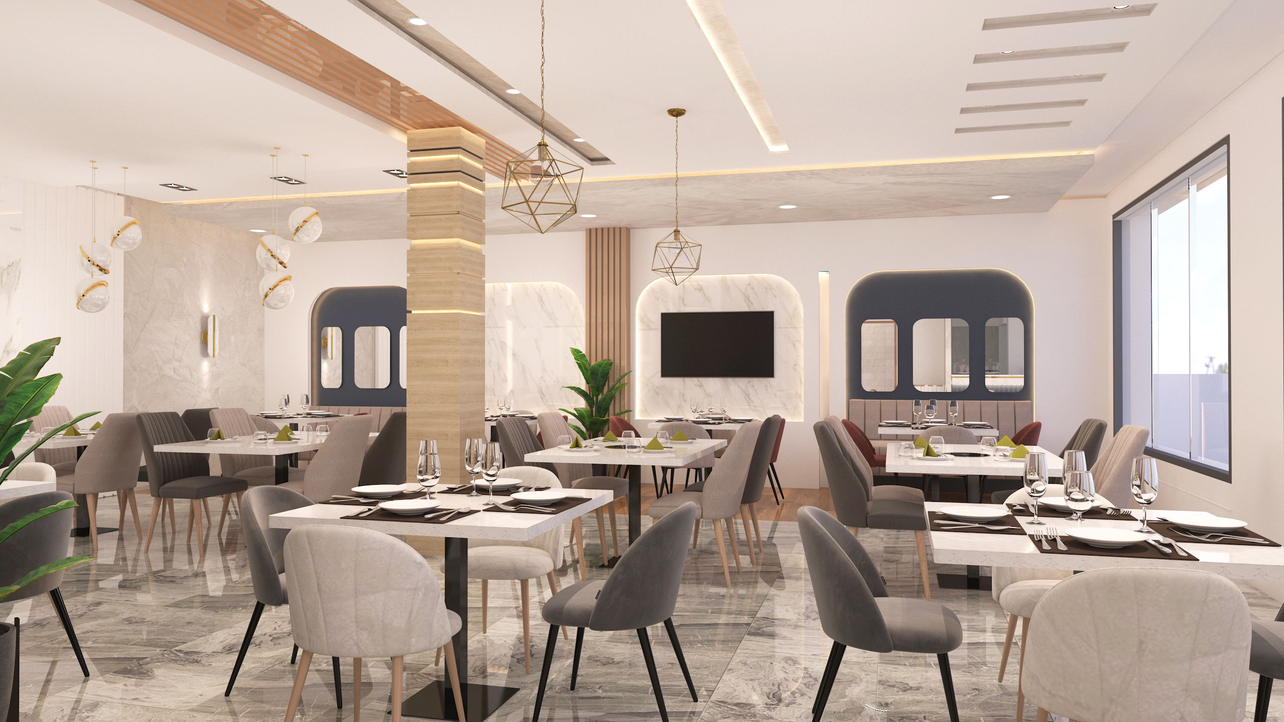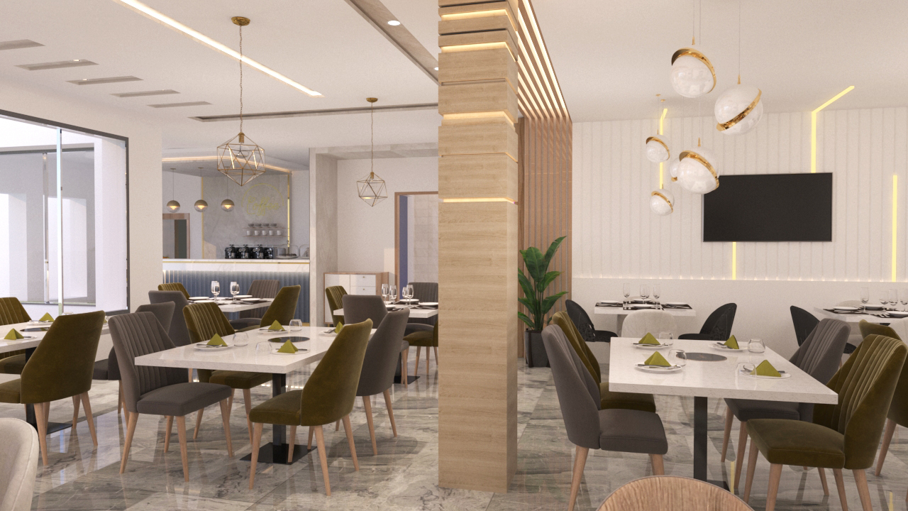 The final result is a luxurious and modern restaurant interior, delivered through high-quality 3D modeling that allows a realistic visualization of the design before execution. This project reflects Archimomi’s expertise in creating refined commercial interiors that balance elegance, functionality, and contemporary design.