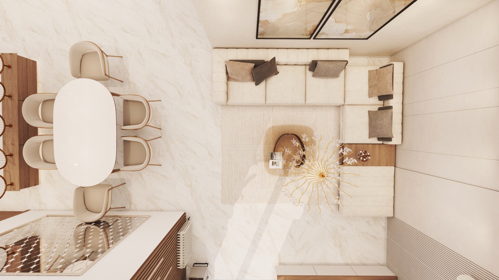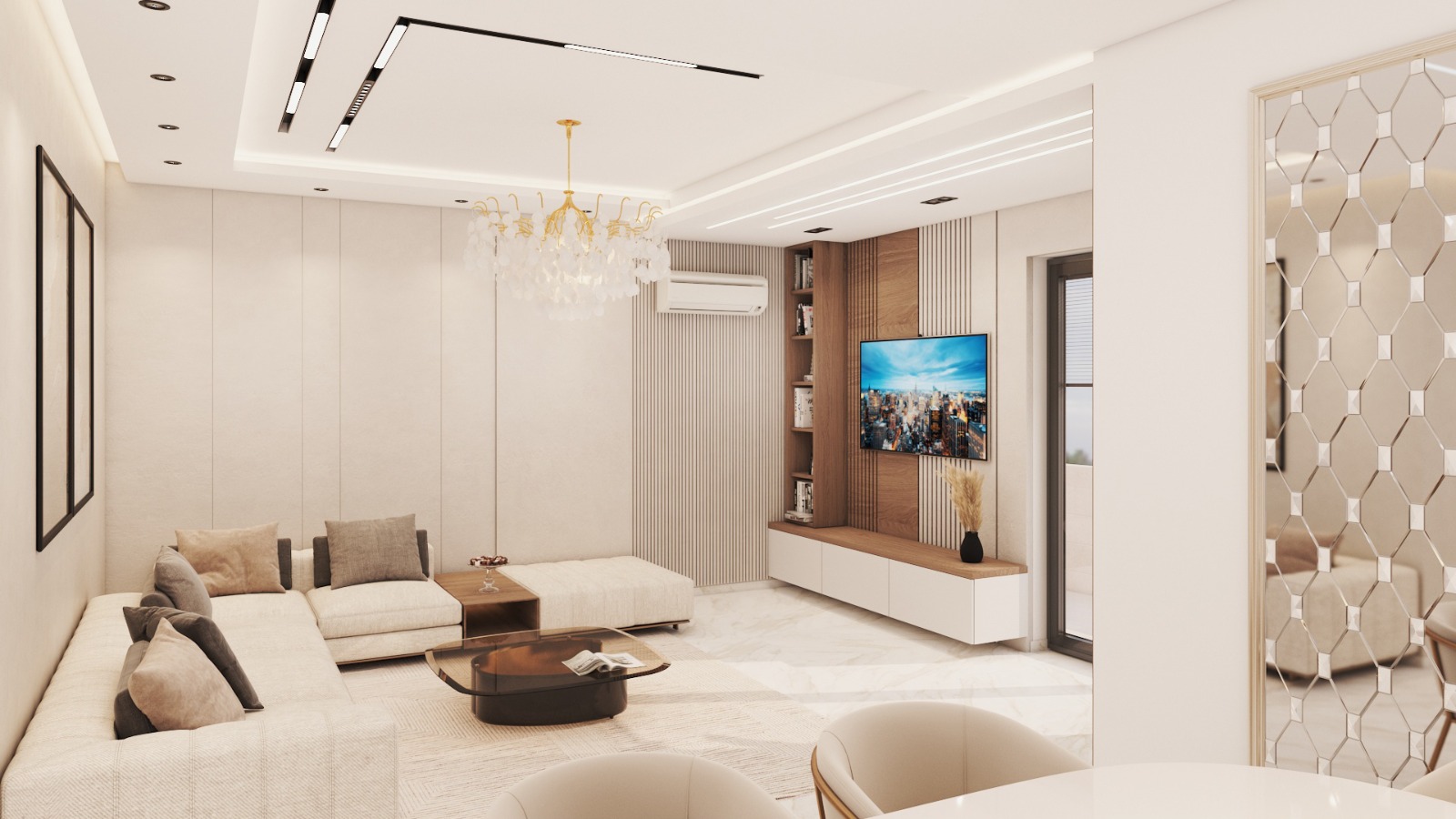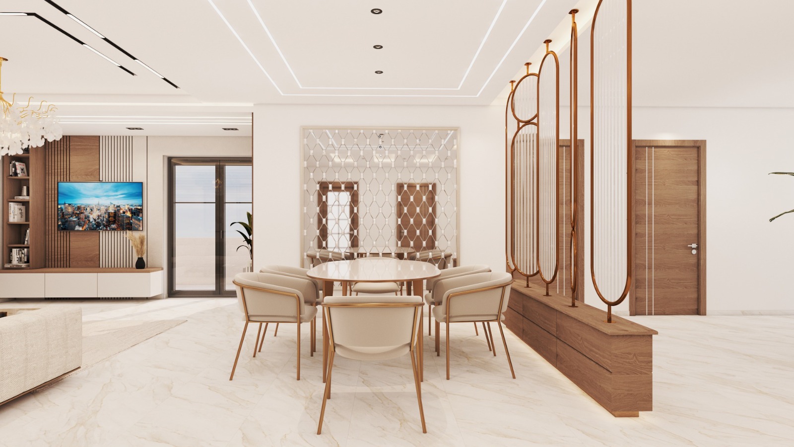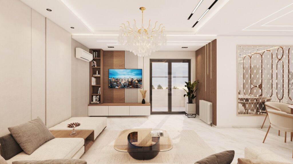 Designed as the heart of the villa, the living room combines luxurious materials, high-end finishes, and elegant furniture. Lighting, textures, and layout are carefully curated to create a warm, inviting, yet opulent atmosphere.