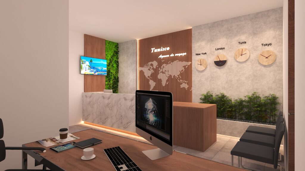 The final result is a modern, functional, and visually refined travel agency interior, demonstrating Archimomi’s expertise in commercial interior design and architectural visualization.